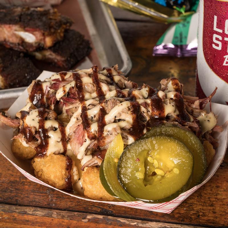 Tots smothered in cheese sauce and topped with smoked pulled pork, Alabama white BBQ sauce, Kansas City BBQ sauce and house pickles.